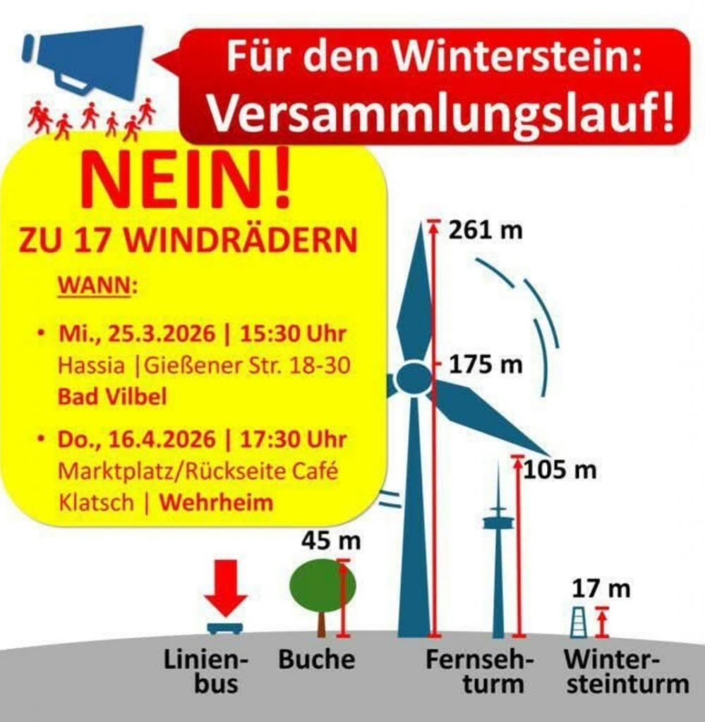„Am 25. März haben wir in Bad Vilbel ein starkes Zeichen für den Schutz des Wintersteins gesetzt. Um die Bürger lückenlos über die Hintergründe des geplanten Windkraftausbaus aufzuklären, haben wir als BI Winterstein hochkarätige Experten eingeladen.